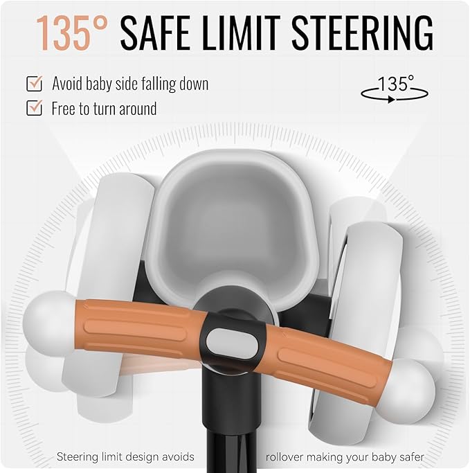 - SAFETY FIRST: 135° steering limiter effectively prevents the baby from turning over. Fully enclosed wheels to avoid clamping baby's feet. TPU handle makes baby's grip firm and hard to get off. No sharp parts, making your baby safer.
