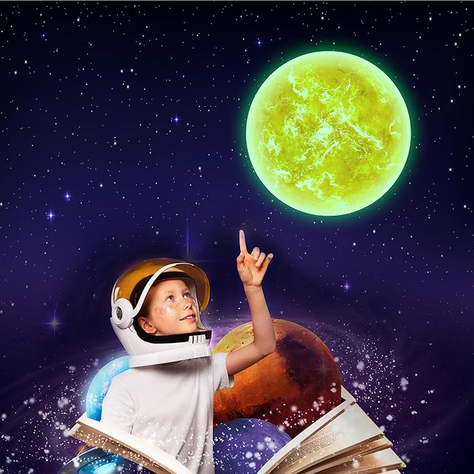 - Robmoda Glow in The Dark Planet - One piece of sun sticker made up of non-toxic, eco-friendly, waterproof, pressure resistant, shock resistant& durable fluorescent PVC. It comes in 23.5 cm (9.25โ).