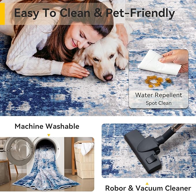- Tides Series โ Effortless style that flows with your life.This modern machine-washable non-slip rug features reinforced edges and a low-pile design that resists dirt. Its water-repellent surface makes spills easy to clean - liquids bead up for quick wiping. Simply machine wash in cold water (no bleach) to refresh. The non-slip backing keeps it securely in place. A perfect blend of function and contemporary design for active homes.