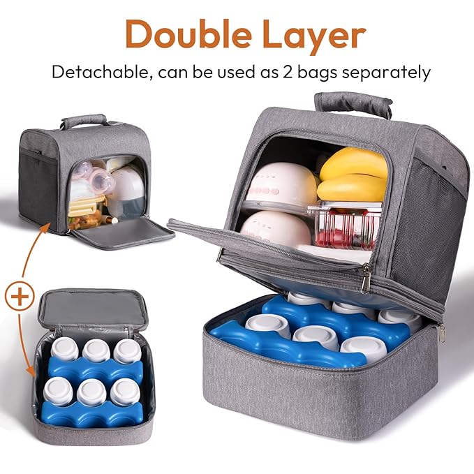 - Flexible Use Anywhere: The detachable double-layer breast pump bag adapts to your needs. It can be used as one complete backpack or two separate organizers. The top layer is used to store breast pumps and accessories, etc. The bottom layer can store items that need to keep fresh, such as breast milk, baby food, fruits