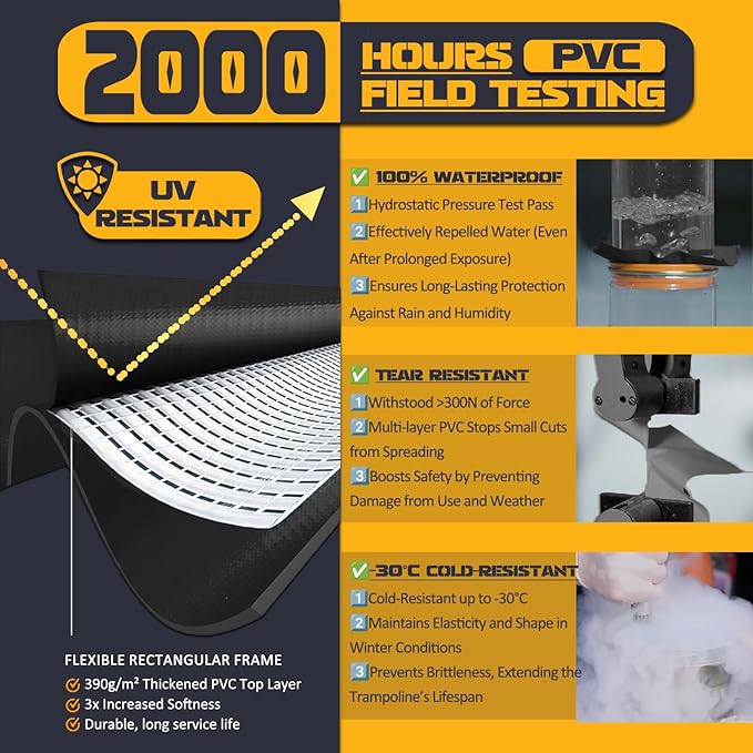 - âď¸ă UV-Resistant & Weatherproof Trampoline Pad for Long-Lasting UseăEngineered with 2000-hour UV resistance testing, this trampoline cover blocks harmful sun rays & repels water, ensuring year-round outdoor safety. The double-reinforced elastic straps securely wrap around trampoline poles & frames, preventing shifting during play. Ideal as a trampoline mat replacement 14 ft for backyard setups, schools, or recreational centers demanding fade-proof and waterproof protection.Weather resist!
