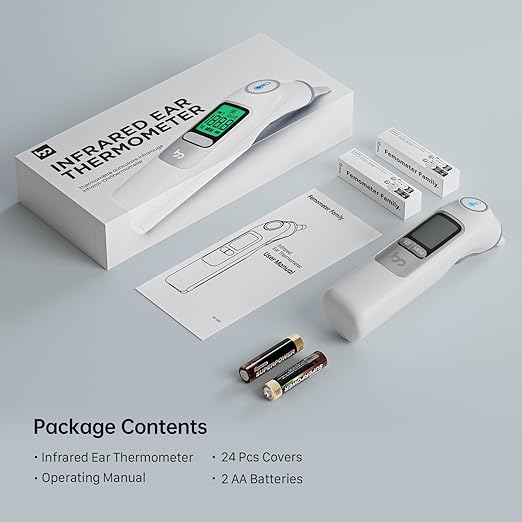 - Included Components : 1×Ear Thermometer, 2×AA Batteries, 24×Probe Covers, 1× Storage Bag, 1×Manual