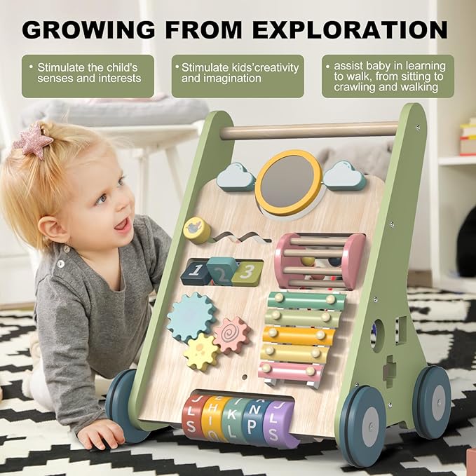 - đăEngaging Multi-Activity CenterăSpark curiosity with this baby walker push toy! Doubling as a vibrant activity walker, it features a xylophone, mirror, shape puzzles, bead maze, and spinning gears. As a premier walking toy for infants 6-12 months, its rainbow colors stimulate senses while developing motor skills. The ultimate activity walker for baby 6-12 months and engaging walker toy!