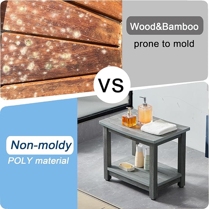 - 【Material & Size】Our gray shower bench is made of polystyrene, it looks like real wood from out look, but actually it's a heavy duty plastic, it's not easy to moldy & rotting after prolonged exposure to humidity, no splinters and no maintenance ( 21.3 x 14 x 17.3 Inches).