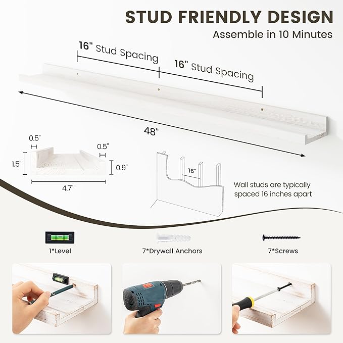 - 【Seamless Installation】Our Picture Ledge Shelves set is designed for easy and simple installation. The package includes all the necessary hardware to get your wood floating shelves up on the wall in no time. Follow the instructions provided, and your wall shelf will be ready to use within minutes.
