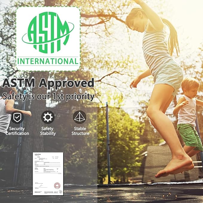 - 【Safety is NO.1】Safety is our top priority. Our 8ft trampoline for kids meets ASTM F381 and ASTM F2225-15 (R2020) standards, ensuring it's safe for your family. Play with peace of mind, knowing your kids are secure on our trampoline