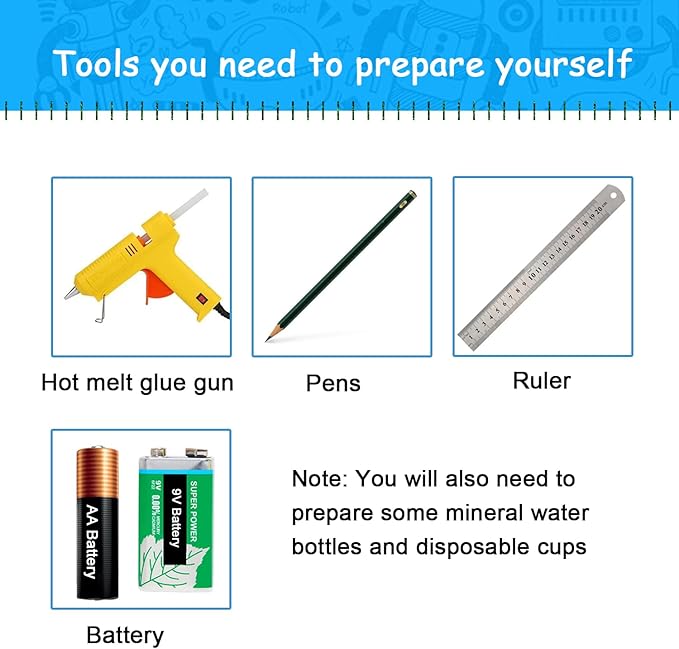 - Pay attention:Suggest to read the instruction manual in detail for assembly,Please control the usage time, use time should not exceed 5 minutes each time, to avoid short circuits. When your project is completed or unattended, it is recommended that you turn off the switch, remove the battery, and store it properly.Tools for super glue or hot melt adhesive for bonding are not included in the kits. Be careful of scald caused by short circuits. The kids must use it under the supervision of adults