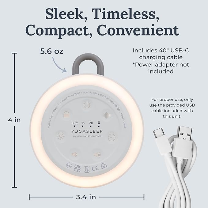 Yogasleep Hushh 2 Portable Sound Machine (Grey) for Baby and Kids, Backlit Buttons & Night Light, Durable, 6 Soothing Natural Sounds, Easy to Use Timer, Volume Control & Toddler Lock, Noise Canceling