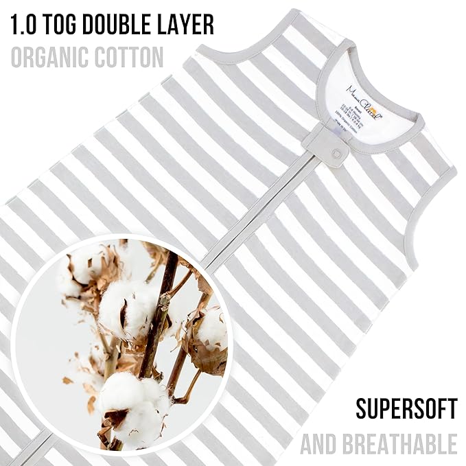 • 【DOUBLE LAYER 1.0 TOG 100% Organic Cotton】— This Baby Sleeping Bag is made of double layer premium organic cotton with a TOG rating of 1.0, which is most suitable for moderate seasons or climates, can help your baby get a peaceful, long sleep year-round being not too hot or cold. The organic cotton interlock makes sure that overheating will not occur and keeps your baby warm and comfortable.