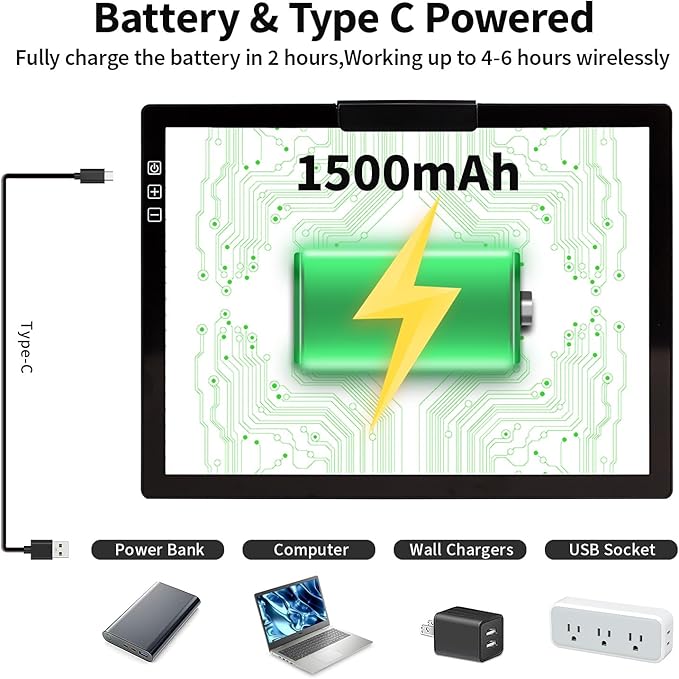- 【Rechargeable battery & USB Powered with Type-C Port】Zocelight's light box offers wireless tracing for 4-6 hours after just 2 hours of charging, making it perfect for on-the-go creativity.ensuring uninterrupted creative inspiration.led light pad offers USB and battery operation for convenient use anywhere. With Type-C charging port and 1.8m cable, it's versatile and portable.