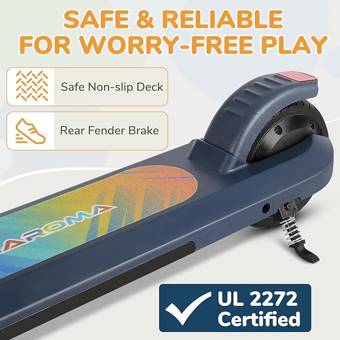 - 🌟Enjoy safe riding:The kids electric scooter adopts a start-up assist design tailored for children. The motor will not start until the riding speed reaches 2mph/h, thus avoiding the accidental start of the scooter. The dual function design of the rear wheel is both a fender and a foot brake for easy and quick deceleration. The electric scooter for kids also comes with non-slip pedals and handles to provide your child with a convenient, safe, stable and enjoyable ride.