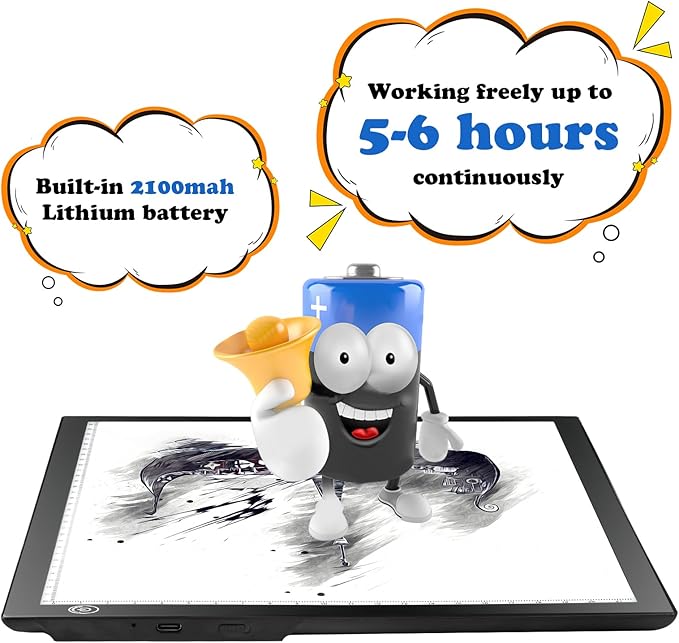 - Portable & Rechargeable: The A4 light pad is designed to be thin and light weight, thus it's portable so that you can take the board with you as you like. Built-in 2100mAh rechargeable battery, whether you want to be on the grass outdoors, or at home on your comfortable sofa, or in a leisurely coffee store, you can enjoy a wonderful drawing time at any time