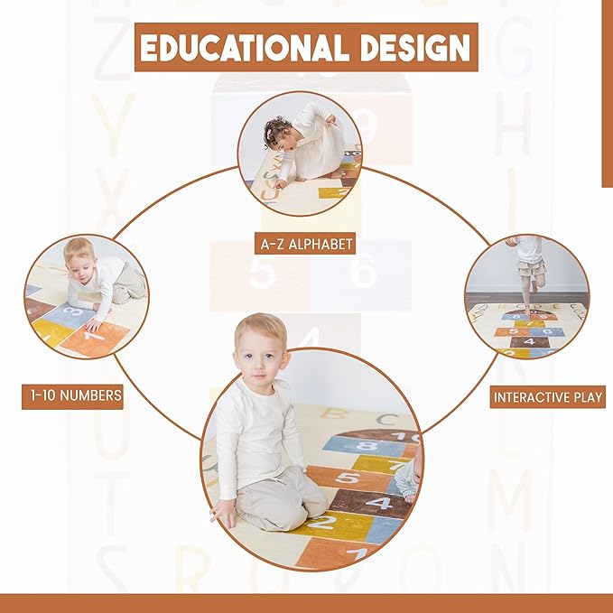 - ๐๐ฎ๐ ๐๐จ๐ซ ๐ ๐ฎ๐ง & ๐๐๐๐ซ๐ง๐ข๐ง๐ : All you need are some good neutral modern colors, hopscotch, and the alphabet, and you have the perfect toddler rug for your toddler room decor. One standout childhood memory of mine is playing hopscotch, and you better believe I was going to pass that experience down to my kids. Now adding the alphabet into the mix has increased the number of games and activities we can come up with using this play mat. This versatile Kids rug for playroom enhances your toddlers playroom decor while providing a playful and educational environment.