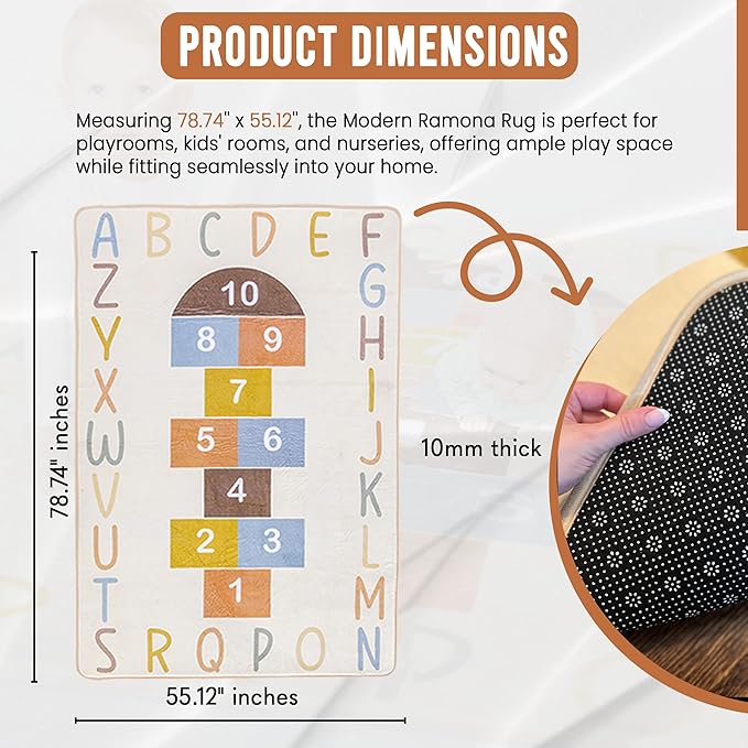 - ๐๐๐ซ๐๐๐๐ญ ๐๐ฅ๐๐ฒ ๐๐ฉ๐๐๐: The gorgeous kids play rug measures 4'7" x 6'6" and is 10mm thick. For those who prefer metric measurements, it converts to 140 x 200 cm or 55.12 x 78.74 inches. Kids room hopscotch rug provide ample space for play and activities, making it a perfect addition to any child's room or play area. The abc rug for kids playroom comes in a generous size and cozy thickness, accommodating various activities and ensuring comfort for your little ones.