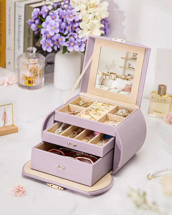 Homde Girls Jewelry Box Jewelry Storage Case Organizer Faux Leather with Mirror for Rings, Earrings, Bracelets, Necklaces (Grey Purple)