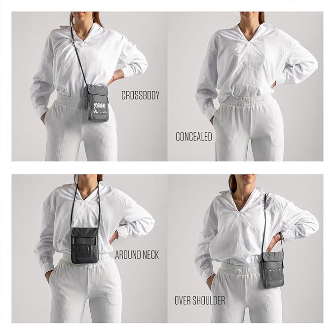 - SPACIOUS AND ORGANIZED – Fits passports, iPhone 15 Pro Max, cash, and tickets with zippered pockets, a Velcro patch, and a clear ID window.