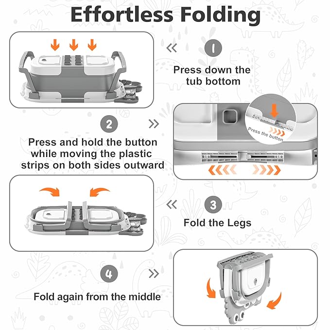 - Double-Fold Collapsible Design: TPN collapsible baby bathtub features an ingenious double-fold design, compactly measuring less than 4 inches in thickness. This facilitates effortless storage in any corner and enhances portability for on-the-go convenience, making it a perfect companion both at home and during travel. The off-the-floor drain with a user-friendly rubber plug guarantees seamless draining without the need for relocation.