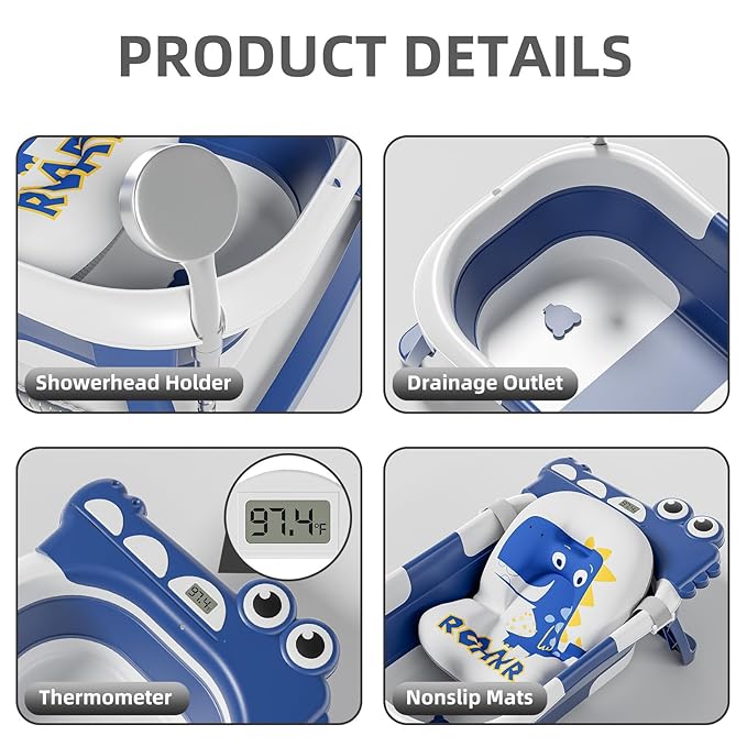 - Visible Real-time Temperature Monitoring: The travel-friendly baby bathtub is equipped with a real-time temperature sensor, offering instant reminders to prevent scalding or exposure to cold water. The wrap-around temperature lock system ensures accurate monitoring, making it a versatile choice for use in bathrooms, homes, during travel, or camping.