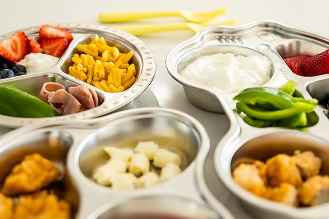 - ✔ Versatile Use From snacks to full meals, these stainless steel divided plates for kids handle it all. Great for home use, school lunches, or picnics. Works well with a variety of foods and feeding styles.