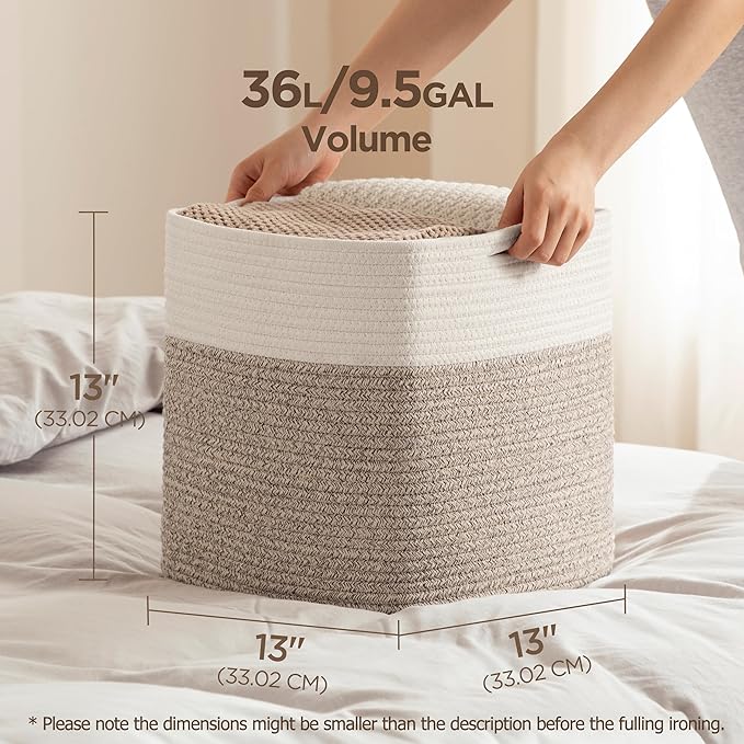 joybest Cube Storage Bins Set of 4, 13inch Cube Baskets Organizer for Nursery, Square Cotton Rope Baskets for Shelves Organizing, Kids Toy, Closet Storage, Brown and Cream White