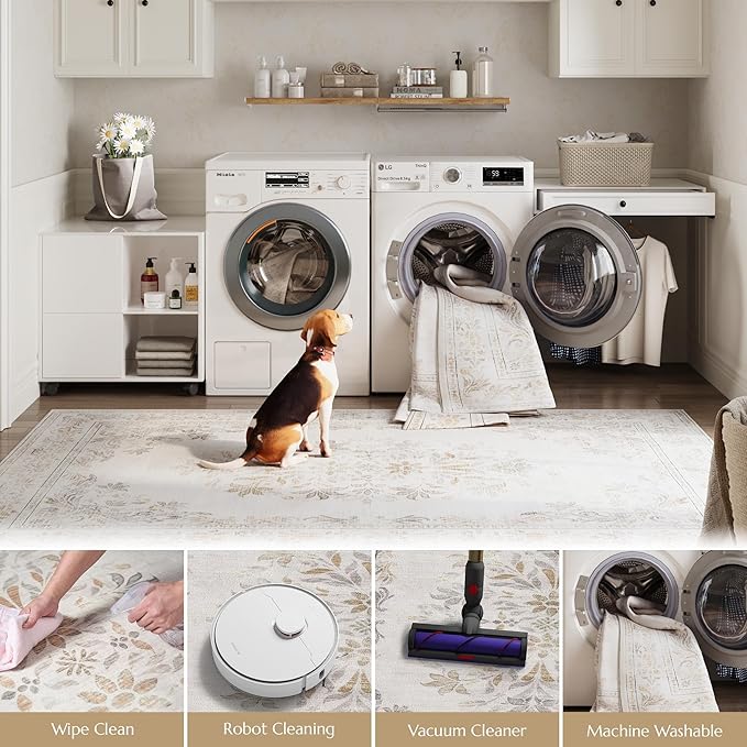 jinchan Vintage Floral 6x9 Area Rugs for Living Room - Machine Washable Distressed Design Soft Throw Rug Ultra-Thin Non-Slip Large Carpet for Bedroom Nursery Dining Room Home Office (6x9ft,Light Grey)