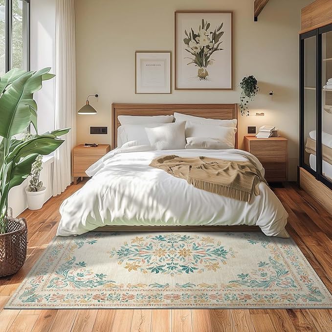 jinchan Floral 5x7 Area Rugs for Nursery - Machine Washable Vintage Distressed Design Soft Ultra-Thin Low-Pile Non-Slip Kids Carpet for Bedroom Living Room Dining Room Home Office (5x7ft,Apricot)