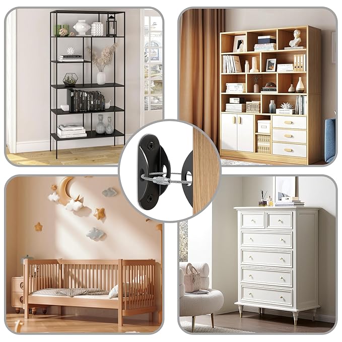 - 【ANTI EARTHQUAKES】:Our heavy-duty furniture anchors can secure bookcases or tall furniture to walls, preventing furniture from sliding and falling in earthquakes and storms, protecting the safety of your family, pets, and furniture.