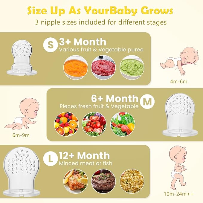 - 【ALL SIZES INCLUDED-Accompany with Your Baby Growth】:small, medium and large three sizes sacs are included in the fruit feeder package to fit different month age baby, S for 4-6 months, M for 6-10 months, L for 10 months+, you can choose the suitable size for your baby at different months.
