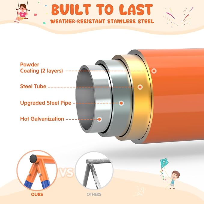 - Heavy Duty Metal A Frame: Our swing set is crafted with 2" lead-free galvanized steel pipe(no fading, rust-resistant) in A-frame design, supporting up to 440 lbs, providing superior stability and safety, it is also U.S. safety certified (CPC and CPSIA)