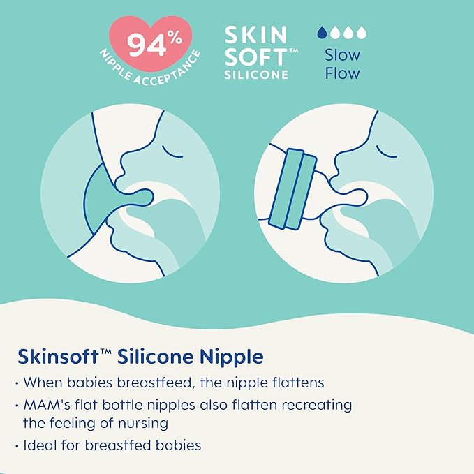 - 94% Nipple Acceptance: With a soft SkinSoft nipple, MAM baby bottles newborn are accepted by 94% of babies, making it easier to switch between breastfeeding and baby bottle feeding.