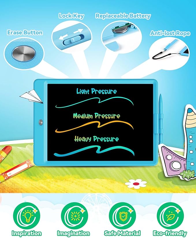 - [Reusable & Environmental]A reusable drawing tablet saves 1,000 sheets of paper. Our drawing boards are very eco-friendly because kids use these pads instead of paper. The writing tablet's battery can be used for 3-6 month and is replaceable. The battery is fixed with screws and are not easily accessible to young children.