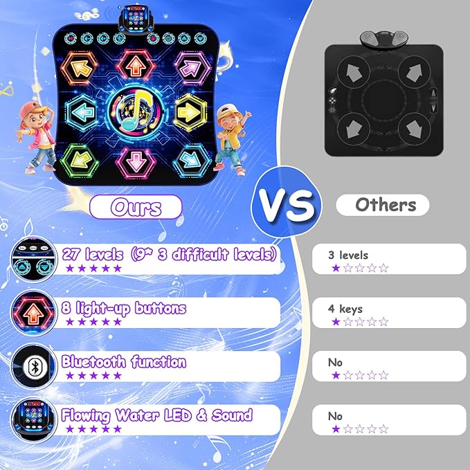 - 【Newest Bluetooth Function & Memory Function】 In unique bluetooth mode, connect the bluetooth dance mat with bluetooth device to play any music you like, so that kids can invite friends to join in the dance with favorite music. Light-up bluetooth dance pad has 9 levels - helping you to choose more fun while experiencing dance activities. Newly upgraded memory mode with 50 challenge levels helps to exercises the brain and improves child's memory in a fun way.