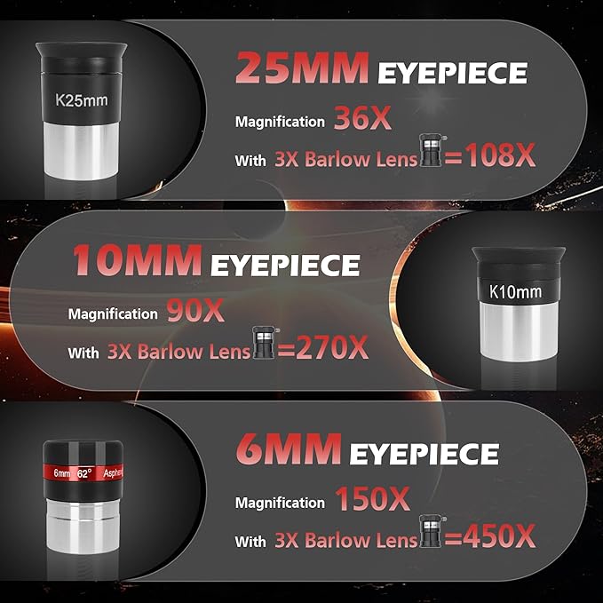 - Magnification 36X-450X: This telescope for adults features 3 eyepieces (25 mm/10 mm/6 mm) and a 3x Barlow lens, offering 36X-450X magnification with a 900 mm focal length. It includes a 5x24 finder scope, phone adapter, and a stargazing mount