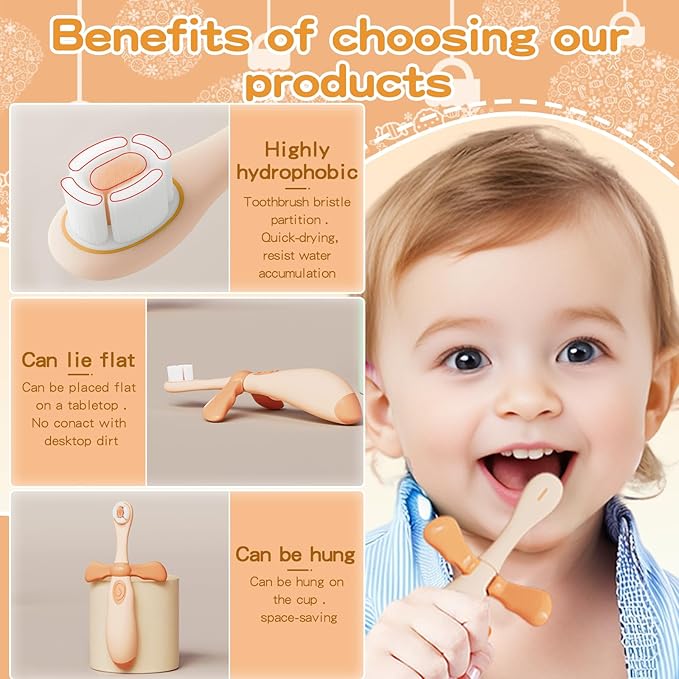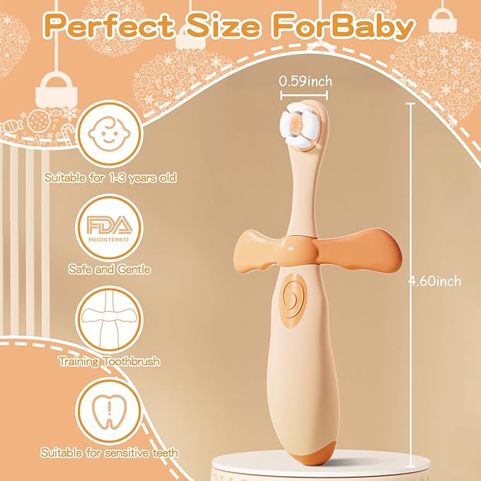 - BABY TRAINING TOOTHBRUSH: The small brush head is just right for 0-3 years old baby's small mouth, help baby learn to brush teeth independently. The right size is just right for baby's little fingers, making it easy for baby to grip the toothbrush. This cute baby training toothbrush helps to help your baby form good oral hygiene habits