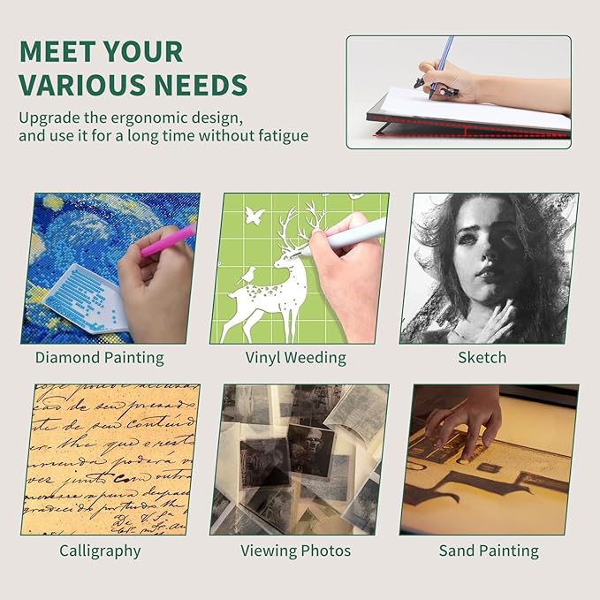 - <๐๐ฎ๐๐๐ฒ๐ฟ๐ ๐ฃ๐ผ๐๐ฒ๐ฟ๐ฒ๐ฑ ๐๐ฒ๐๐ถ๐ด๐ป>: The cordless light drawing pad boasts a rechargeable battery, delivering up to 4 hours of uninterrupted usage with just a single 2.5-hour charge. This functionality elevates the light pad's mobility, empowering users to engage in work or creativity even in settings devoid of power sources. Its portability renders it perfect for outdoor sketching or scenarios where power outlets are scarce. The absence of cords translates to reduced clutter and heightened convenience in your workspace.