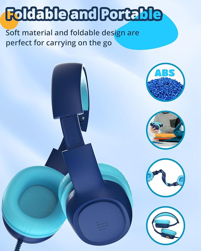 Tronsmart Kids Headphone for School Travel, Foldable Safe Volume 85/93dB, HD Stereo Sound Over-Ear Boys Girls Headphones for Kid, 3.5mm Kids Headphones with Cord for iPad, Kindle, Tablets,KH01(Blue)