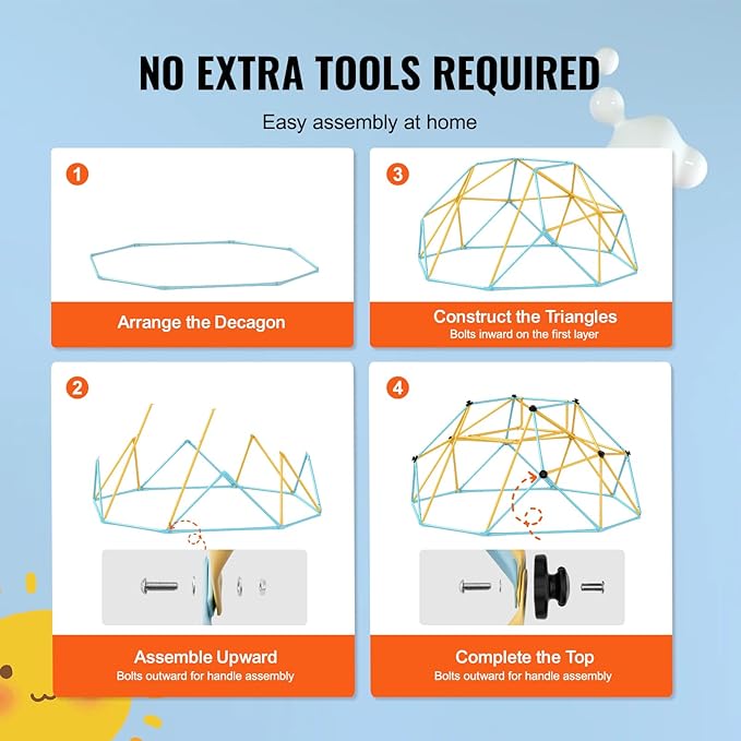 - Easy Setup: Everything you need is included, from installation tools to detailed manuals and video guides. Our clear instructions will effortlessly guide you through assembly, allowing you to quickly create a fun playground for your children with our kids climbing dome.