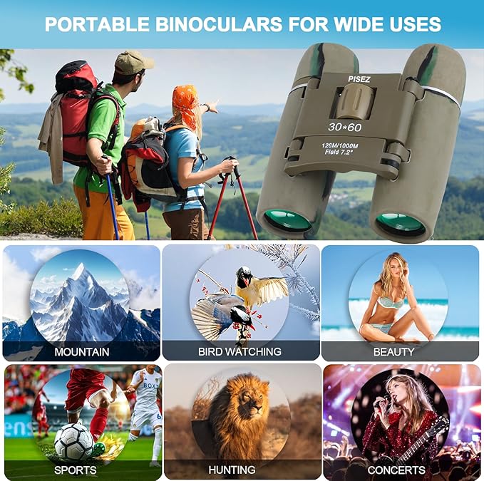 PISEZ 30X60 Compact Binoculars for Adults and Kids,Lightweight Foldable Easy Focus Small Binoculars for Bird Watching Hunting Concert Traveling Theater Opera Sightseeing