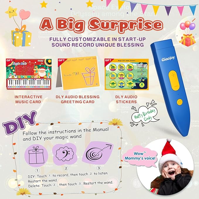 - Customizable Audio Pen for Creativity-This audio pen lets kids record their own stories, songs, or messages with custom startup sounds. The set includes a personalized voice gift card, where parents can record birthday wishes or special messages. It also features music cards and DIY dinosaur stickers, sparking creativity and imagination while making learning fun. Perfect for interactive play and personalized educational experiences, this is a great way to encourage self-expression.