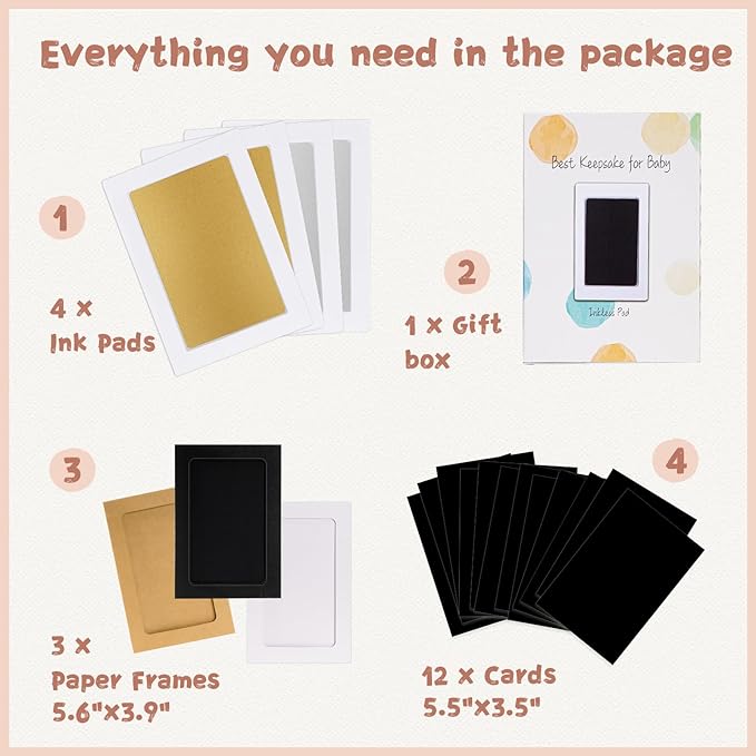 - 【Product Details】: Our baby hand and footprint kit measures 6.0"x4.2" with an ink window of 4.9"x3.1", which is the best size for recording hand and footprints of newborns 0-6 months old or pet paw prints . The ink pad for baby hand and footprints includes 4 clean touch ink pads, 12 stamping cards, and 3 display frames, ensuring you have ample opportunity to capture the best stamp.