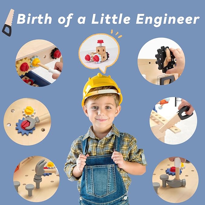 - Montessori‑Inspired Order & Learning – Peg board keeps tools visible; wooden drill and learning clock teach tidiness, counting and time concepts, reinforcing Montessori self‑directed play principles