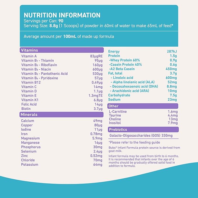 - NO HIDDEN NASTIES: Our Bubs Goat Milk Infant Formula gives parents peace of mind and babies a happy start to their life, with A2 Goat Protein, Omega 3, plus Prebiotics, and may be a good alternative for formula fed babies with sensitive tummies