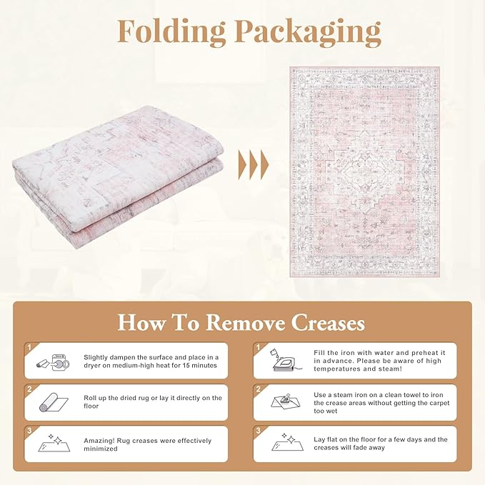 - Folding Packaging--Due to the folding during packaging, the pink area rug may have some creases upon opening. However, the edges are resistant to buckling, and the folds will disappear once the rug is laid flat and ironed.