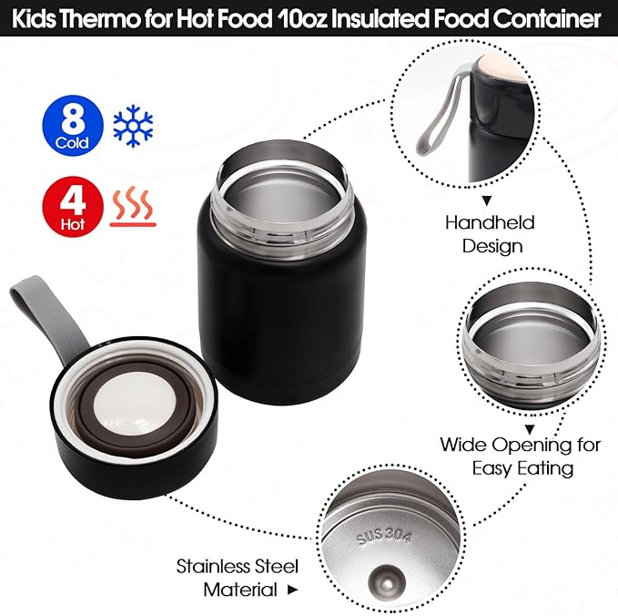 - ๐ค The food thermos measures 3.3 x 5.1 inches and the insulated food jar has a 10 oz capacity, big enough to hold your delicious soup or beverage. The insulated food jar is made of food-grade 304 stainless steel, which has good heat insulation and cold preservation properties.