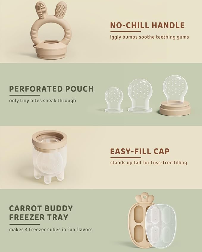 - 【Multi-size replaceable silicone nipple pouches】The combo food feeder provides 2 different sizes of pouches that serve your babies from 4 to 12 months. The nicely shaped pouches are easy to chew and help soothe baby’s sore gums.
