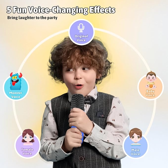 - Magic Voice and Dancing Lights: This microphone for kids transforms your voice with 5 amazing effects! It sounds like a man, woman, cute baby, scary monster! Kids will love creating adventures with different characters. Not only magic voice, but also it creates a dancing light show that pulses to the beat. It's a rainbow explosion of fun! It's the perfect way to add a touch of magic and excitement to playtime.Perfect for party entertainment
