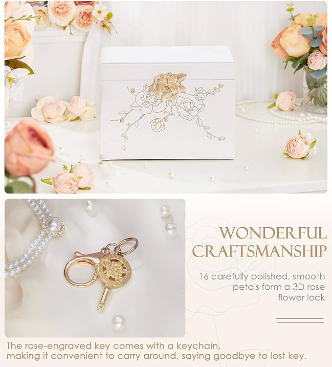 - Leather-Like Design with Lock: The jewelry box's faux leather-inspired design with golden rose accents and a lock ensures both style and security for your treasures.