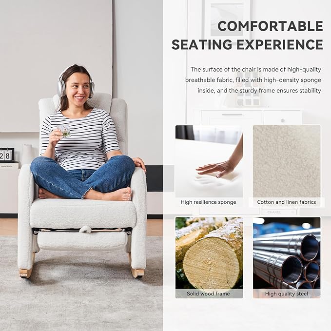 Rocking Chair Nursery, Modern Glider Chair with Adjustable Footrest and Solid Wood Legs, High Backrest Nursery Chair with Side Pocket, Rocker Armchair for Living Room Bedroom, Teddy Ivory