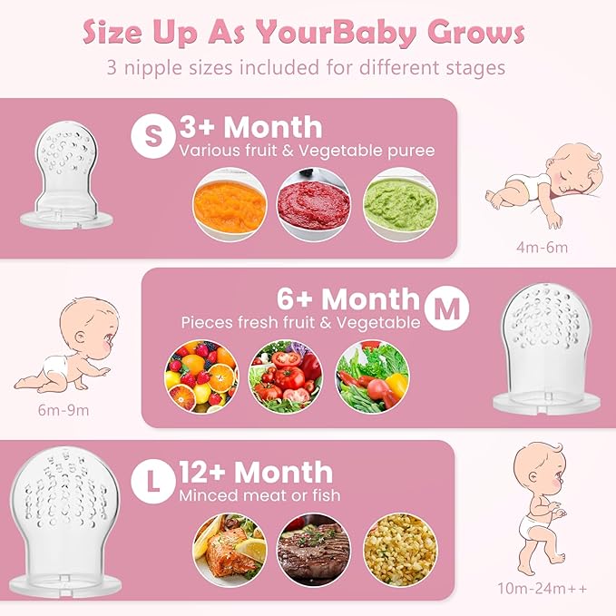 - 【ALL SIZES INCLUDED-Accompany with Your Baby Growth】:small, medium and large three sizes sacs are included in the fruit feeder package to fit different month age baby, S for 4-6 months, M for 6-10 months, L for 10 months+, you can choose the suitable size for your baby at different months.