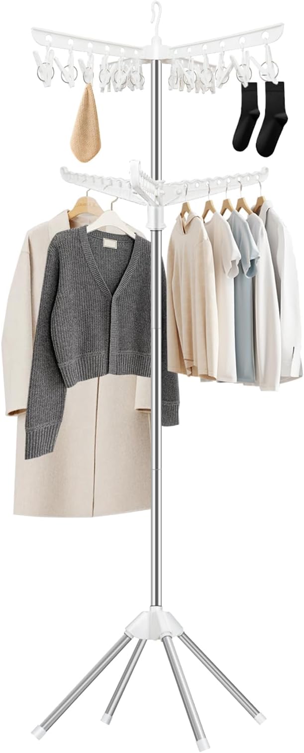 - [Efficient Drying & Storage]The SUYU Drying Rack boasts a dual-tier design with 24 upper clips and 3 hanging arms, featuring 27 hanging holes for a variety of garments, ensuring efficient drying and organized storage for all your clothes and accessories.